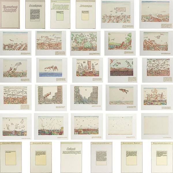 Пустое содержание хвалёного коллективизма советских людей, по идее – с высокими помыслами (вон, летают), а на деле – их общие ощущения: всего лишь ветер. Низшее из ощущений. Совки. А как не образно, а катарсически? Двумя вариантами. Один – доведением зрителя скукой Правил до предвзрыва, предполагающего взрыв такой силы, что он вышвырнет душу восприемника в метафизическое иномирие. Другой доведение чувствительных до стремления покинуть Этот мир за его неопределённость – в иномирие же. Для первого варианта приобщение к искусству происходит в форме перформанса. Надо исполнять ряд правил приобщения. Во-первых, это должны быть специально приглашённые люди. Все объекты оформлены в альбом. Альбомом распоряжается сам Кабаков. Перелистывает. Возможно, читает написанное. Даёт смотреть. Задаёт мерный темп всего процесса. – Чтоб довести вас до предзрыва от давления Правил на Этом свете, отдалённо перекликающихся с тоталитаризмом в СССР. А строго говоря – всюду. Для второго варианта организовывается Неизвестность, что происходит: смотрение или чтение. Приглашённых Кабаков знает, что они не переносят принципиальную на Этом свете Неизвестность. – Вот они и взволновываются и стремятся в иномирие. Приобщение к Нему, принципиально недостижимому даёт чувство удовлетворения в результате. И, что нарисовано, не имеет значения. Тихий ужас. Если ценность живописи в исполнении и вымысле, то вымысел лишается смысла. Исполнение – вы сами видели – нарочито корявое. 29 декабря 2023 г.